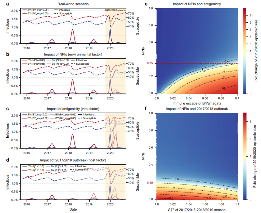 图.非药物干预措施(环境)、抗原保守性(病原)、2017/2018流行季Yamagata谱系大规模暴发(宿主)在Yamagata谱系灭绝中的作用