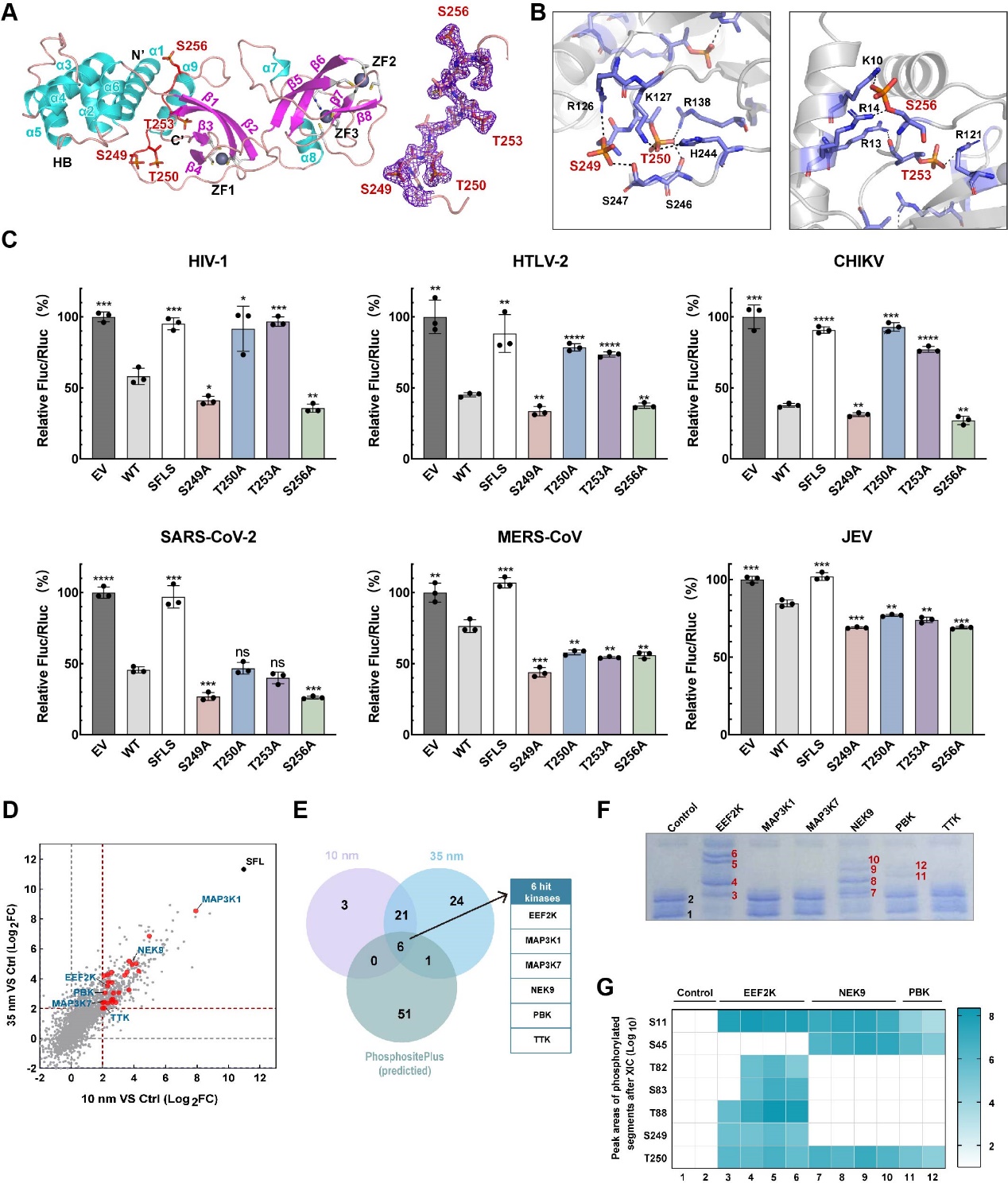 Shiftless(SFL)作为另一种干扰素刺激因子,能够通过不同途径抑制多种病毒的复制,包括丙型肝炎病毒(HCV)、登革热病毒(DENV)、西尼罗病毒(WNV)、寨卡病毒(ZIKV)、基孔肯雅病毒(CHIKV)和新冠病毒(SARS-CoV-2)等。近年来有研究表明SFL能够通过调节程序性-1核糖体移码(-1 PRF)过程有效地抑制HIV-1复制,但其抗病毒分子机制尚未完全阐明。研究团队首次解析了人SFL全长蛋白高分辨率(2.0 Å)结构,发现其具有三个锌指结构域以及一个“超磷酸化环”。四个磷酸化的氨基酸残基(p-Ser249、p-Thr250、p-Thr253和p-Ser256)位于“超磷酸化环”上,它们对SFL与HIV-1 RNA亲和力产生不同程度的影响。深入研究发现,p-Thr250和p-Thr253在SFL介导的-1 PRF途径抑制病毒复制过程中发挥了关键作用。利用邻近生物素化标记技术,研究团队进一步鉴定到了三个负责SFL磷酸化的Ser/Thr激酶(EEF2K、NEK9和PBK)。本研究揭示了SFL调控-1 PRF的机制,并为SFL在免疫中的作用提供了见解,有望提供新的广谱抗病毒策略。