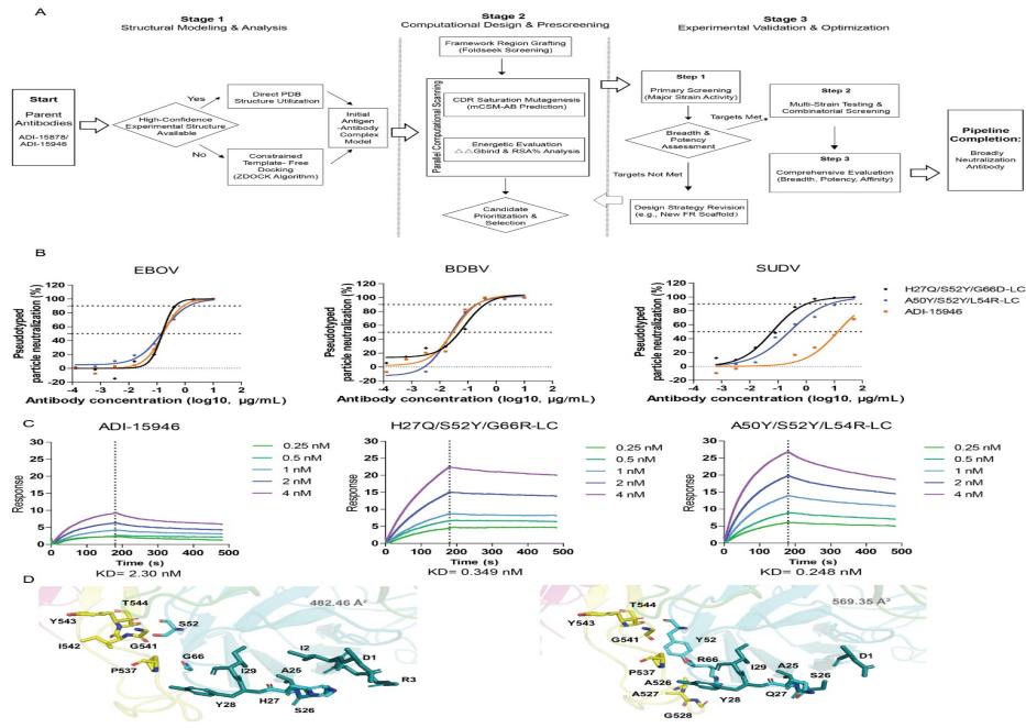 图. 广谱埃博拉抗体计算优化管线与核心设计策略及效果验证